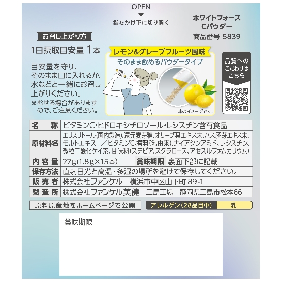 HOME 食品/点心 保健品 亮白營養素 粉末 NEW 熱門推薦 FANCL 亮白營養素 粉末 15支 1盒 免稅價格¥2,290 6314100128 / 4908049622657 免稅價格 ¥2,290 6314100128 / 4908049622657 添加了FANCL特有的三重維生素C(維生素C誘導體、油性維生素C、水溶性維生素C)1000mg的亮白營養素粉末!清爽的檸檬和葡萄柚味粉末,無需喝水即可服用。外出或旅行時,方便攜帶。隨時隨地用心呵護透明美肌。 返回一覽 更多FANCL商品 *實際的商品顏色可能有所不同,敬請見諒。 *免稅價格及銷售商品將依狀況有所變更,敬請見諒。 *網站刊登的商品有可能斷貨或售完,尚請見諒。本站不銷售菸酒類給未成年顧客。 關聯商品 NEW 熱門推薦 FANCL Deep Charge 膠原蛋白 果凍 約30天份(20g × 10條) × 3 ¥5,700 6314100113 NEW 熱門推薦 FANCL 血糖支援 超值裝 約90天份90粒 × 3 ¥4,140 6314100132 NEW 熱門推薦 FANCL 固醇支援 約30日份60粒 ¥2,500 6314100116 NEW 熱門推薦 FANCL 高階版熱控 約30次用量120粒 ¥5,080 6314100123 NEW 熱門推薦 FANCL 高階版熱控 超值裝 約90次用量120粒 × 3 ¥14,490 6314100124 此頁面適用於20歲以上的顧客 出生日期 年 2025 2024 2023 2022 2021 2020 2019 2018 2017 2016 2015 2014 2013 2012 2011 2010 2009 2008 2007 2006 2005 2004 2003 2002 2001 2000 1999 1998 1997 1996 1995 1994 1993 1992 1991 1990 1989 1988 1987 1986 1985 1984 1983 1982 1981 1980 1979 1978 1977 1976 1975 1974 1973 1972 1971 1970 1969 1968 1967 1966 1965 1964 1963 1962 1961 1960 1959 1958 1957 1956 1955 1954 1953 1952 1951 1950 1949 1948 1947 1946 1945 1944 1943 1942 1941 1940 1939 1938 1937 1936 1935 1934 1933 1932 1931 1930 1929 1928 1927 1926 1925 1924 1923 1922 1921 1920 1919 1918 1917 1916 1915 1914 1913 1912 1911 1910 1909 1908 1907 1906 1905 月 1 2 3 4 5 6 7 8 9 10 11 12 日 1 2 3 4 5 6 7 8 9 10 11 12 13 14 15 16 17 18 19 20 21 22 23 24 25 26 27 28 29 30 31 下次省略輸入 是的否 *如果使用共享電腦,請選擇“否” 未滿20歲的顧客,無法瀏覽酒類和煙草制品。 瀏覽 跳往首頁 本店不向未成年人出售酒類與煙草。 商品已放入購物車 繼續購物 沉降