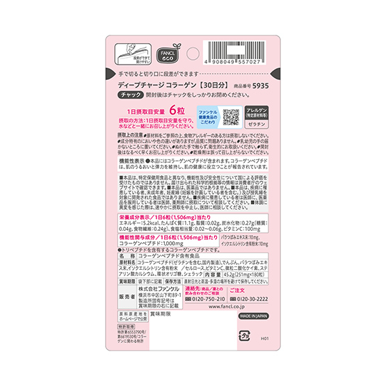 HOME 식품/다른 보충 Deep Charge Collagen(tablet) (Economy set of 3 packets) FANCL Deep Charge Collagen(tablet) (Economy set of 3 packets) 免税価格¥4,140 6314100080 / 4908049561161 Approx. 90 days (Economy set of 3 packets) 1 packet (180 tablets) x 3 免税価格 ¥4,140 6314100080 / 4908049561161 Approx. 90 days (Economy set of 3 packets) 1 packet (180 tablets) x 3 サイズ(数量) 約30日分 180粒 約90日分(3袋セット)1袋(180粒) 数量 1 2 3 4 5 6 7 8 9 10 カートにいれる お気に入りに追加 ご注文可能店舗 나리타 공항 나리타 공항 제1터미널 나리타 공항 나리타 공항 제2터미널 이바라키 공항 이와테 하나마키 공항 Preserve your skin’s moisture and elasticity with a highly absorbent mixture of collagen peptide—the product of FANCL’s expertise in research. This Food with Function Claims has been thoroughly verified for its functionality. It lays the foundation for skincare, supporting total daily moisture so that you can always smile with confidence. Making it easy to continue its use. For those who give it their all every day.[Food with Function Claims] ご注文可能店舗 나리타 공항 나리타 공항 제1터미널 나리타 공항 나리타 공항 제2터미널 이바라키 공항 이와테 하나마키 공항 一覧に戻る FANCLの商品をもっと見る ※実際の商品の色と異なる場合がありますのでご了承ください。 ※免税価格および取扱い商品は、都合により変更させていただく場合がございます。 ※サイト上に掲載している商品でもお品切れ・完売となっている場合がございますのでご了承ください。未成年者へのお酒・たばこ類の販売はいたしておりません。 関連商品から探す NRT1NRT2IBRHNA SUNTORY WELLNESS Locomore 360 tablets※1인 6점까지 ¥9,900 0017320991 NRT1NRT2IBRHNA SUNTORY WELLNESS Milcolla 30pc※1인 6점까지 ¥5,400 6313020004 免税店限定NRT1NRT2IBRHNA SUNTORY WELLNESS Sesamin EX 270 softgels※1인 6점까지 ¥10,500 0017171003 NRT1NRT2IBRHNA SUNTORY WELLNESS Royal Jelly + Sesamin E 120 capsule※1인 6점까지 ¥5,800 0017320996 NRT1NRT2 FANCL Deep Charge Collagen Powder (Economy set of 3 boxes) ¥9,240 6314100084