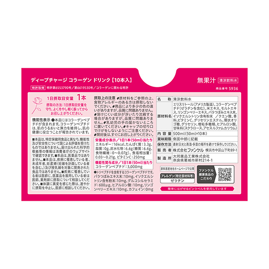 HOME 식품/다른 보충 Deep Charge Collagen Drink FANCL Deep Charge Collagen Drink 免税価格¥2,350 6314100081 / 4908049557058 Contains 10 bottles 1 box 免税価格 ¥2,350 6314100081 / 4908049557058 Contains 10 bottles 1 box 数量 1 2 3 カートにいれる お気に入りに追加 ご注文可能店舗 나리타 공항 나리타 공항 제1터미널 나리타 공항 나리타 공항 제2터미널 이바라키 공항 이와테 하나마키 공항 Preserve your skin’s moisture and elasticity with a highly absorbent mixture of collagen peptide—the product of FANCL’s expertise in research. This Food with Function Claims has been thoroughly verified for its functionality. It lays the foundation for skincare, supporting total daily moisture so that you can always smile with confidence. The drink type is also fortified with glucosylceramide and hyaluronic acid, among other ingredients. It is recommended that you make a habit of drinking it chilled just after taking a bath. A fruity peach flavor that is easy to drink.[Food with Function Claims] ご注文可能店舗 나리타 공항 나리타 공항 제1터미널 나리타 공항 나리타 공항 제2터미널 이바라키 공항 이와테 하나마키 공항 一覧に戻る FANCLの商品をもっと見る ※実際の商品の色と異なる場合がありますのでご了承ください。 ※免税価格および取扱い商品は、都合により変更させていただく場合がございます。 ※サイト上に掲載している商品でもお品切れ・完売となっている場合がございますのでご了承ください。未成年者へのお酒・たばこ類の販売はいたしておりません。 関連商品から探す NRT1NRT2IBRHNA SUNTORY WELLNESS Milcolla 30pc※1인 6점까지 ¥5,400 6313020004 免税店限定NRT1NRT2IBRHNA SUNTORY WELLNESS Sesamin EX 270 softgels※1인 6점까지 ¥10,500 0017171003 NRT1NRT2 FANCL Deep Charge Collagen Powder (Economy set of 3 boxes) ¥9,240 6314100084 NRT1NRT2 FANCL From 50s Supplement - for Women 30 to 90 days 30 packets (1 packet contains 7 tablets)×3 ¥12,350 6314100105 NRT1NRT2IBRHNA SUNTORY WELLNESS Royal Jelly + Sesamin E 120 capsule※1인 6점까지 ¥5,800 0017320996