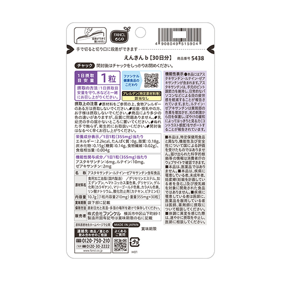 HOME 食品/其他 補充 明目健眼綜合營養 FANCL 明目健眼綜合營養 約30天份 30粒×3 免税価格¥5,530 6314100110 / 4908049561222 免税価格 ¥5,530 6314100110 / 4908049561222 サイズ(数量) 約30日分(30粒) 約30日分(30粒)×3 数量 1 2 3 4 5 6 7 8 9 10 カートにいれる お気に入りに追加 ご注文可能店舗 成田机场 成田机场第 1 航站楼 成田机场 成田机场第 2 航站楼 茨城机场 岩手花卷机场 適合對視力有擔憂的成年人,例如難以集中註意力在手邊的物品上、眼睛疲勞、閱讀小字時模糊以及與早上相比晚上看東西困難。視力支持營養素是一種具有功能聲稱的食品,是FANCL精心挑選的三種物質的複雜混合物:蝦青素、葉黃素和玉米黃質。經驗證,它可以保持近距離對焦,減少眼睛疲勞感,保護眼睛免受光刺激,並減少模糊以支持視力清晰度*。開始您的照護方案,讓未來的日子更加晴朗。*來自功能物質的研究評論。*1:改善近距對焦的功能*2:減少模糊和提高視力清 晰度的功能以及增加黃斑色素數量的功能這些來自功能物質(葉黃素)的成分文獻評論(研究評論)。[具有功能聲稱的食品] ご注文可能店舗 成田机场 成田机场第 1 航站楼 成田机场 成田机场第 2 航站楼 茨城机场 岩手花卷机场 一覧に戻る FANCLの商品をもっと見る ※実際の商品の色と異なる場合がありますのでご了承ください。 ※免税価格および取扱い商品は、都合により変更させていただく場合がございます。 ※サイト上に掲載している商品でもお品切れ・完売となっている場合がございますのでご了承ください。未成年者へのお酒・たばこ類の販売はいたしておりません。 関連商品から探す NRT1NRT2IBRHNA SUNTORY WELLNESS Locomore 360 tablets*Limit 6 items per person ¥9,900 0017320991 NRT1NRT2IBRHNA SUNTORY WELLNESS Milcolla 30pc *Limit 6 items per person ¥5,400 6313020004 免税店限定NRT1NRT2IBRHNA SUNTORY WELLNESS Sesamin EX 270 softgels*Limit 6 items per person ¥10,500 0017171003 NRT1NRT2IBRHNA SUNTORY WELLNESS Royal Jelly + Sesamin E 120 capsule*Limit 6 items per person ¥5,800 0017320996 NRT1NRT2 FANCL Deep Charge 膠原蛋白 粉末(3套裝) ¥9,240 6314100084